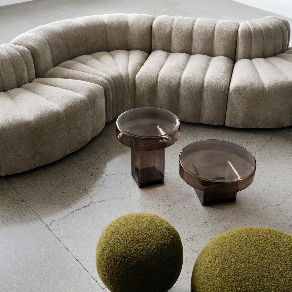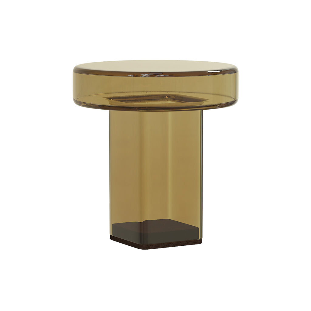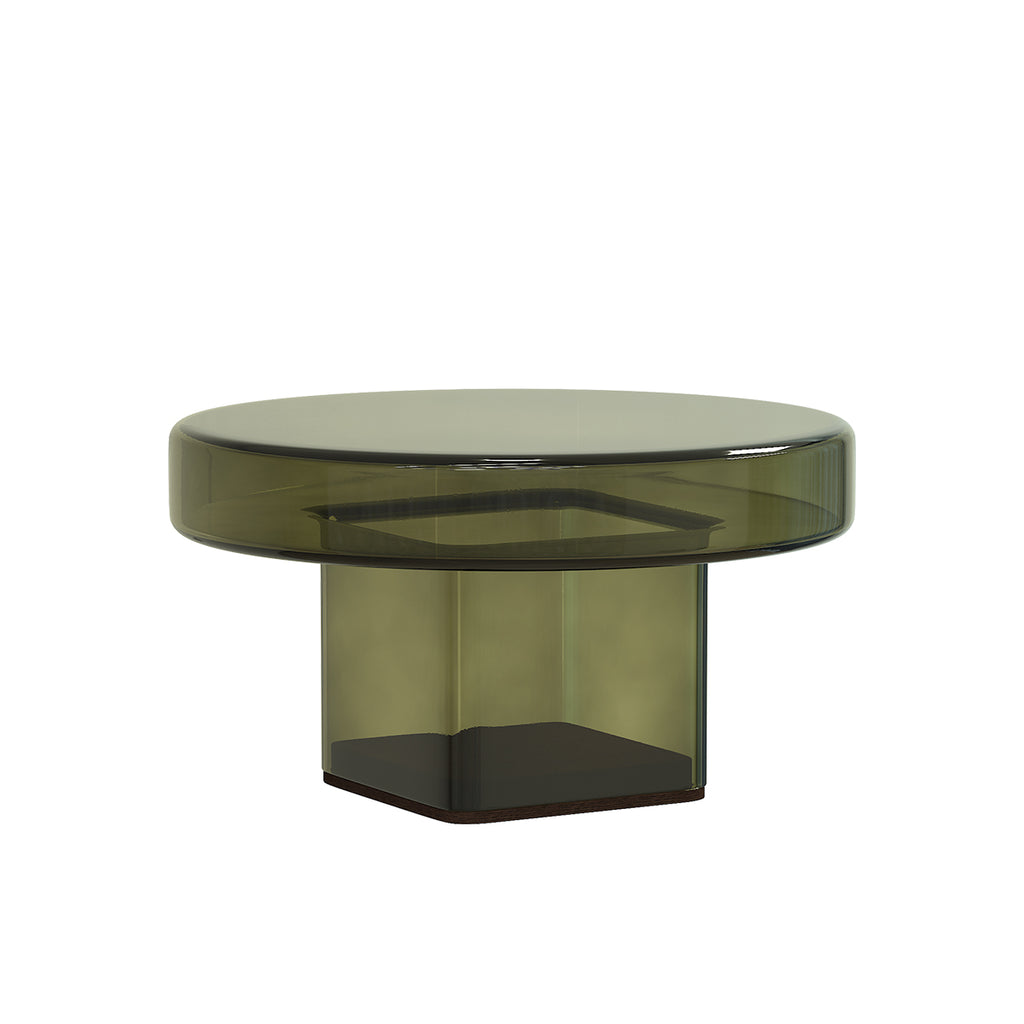 Subtiliai sustorintas apskritas stalviršis ant kolonos formos kvadratinės bazės sukuria drąsią formą, o stiklas suteikia lengvumo pojūtį. Kiekvienas stalas pagamintas iš vienos pūsto stiklo dalies, dažytas iš vidaus ir tvirtinamas prie juodo ąžuolo pagrindo. Nedideli oro burbuliukai ar storio skirtumai – natūralūs rankų darbo ženklai, darantys kiekvieną stalą unikalų.