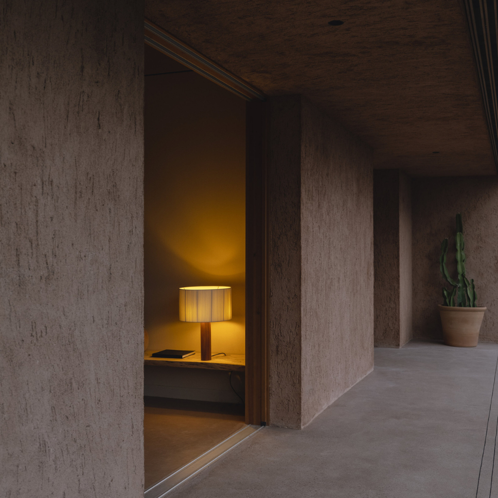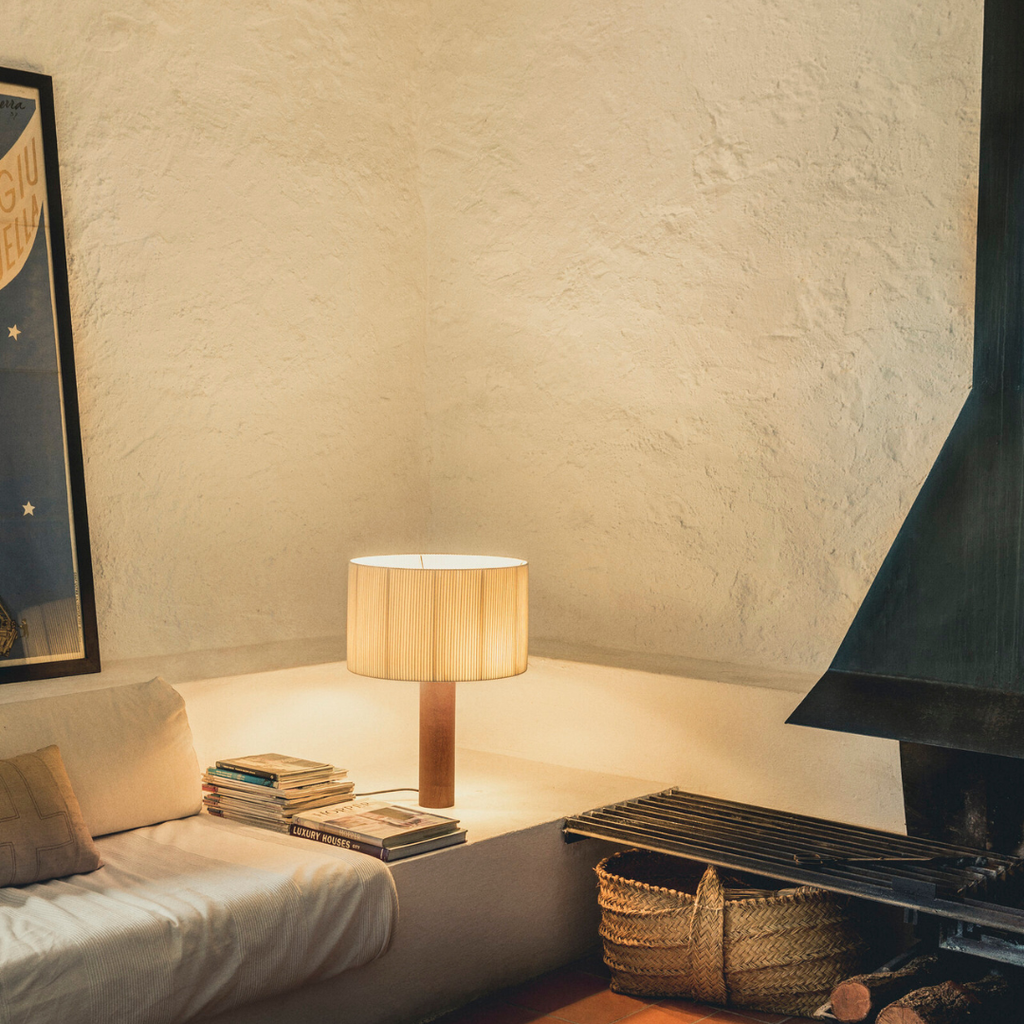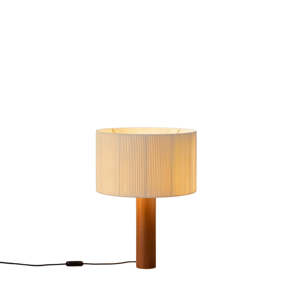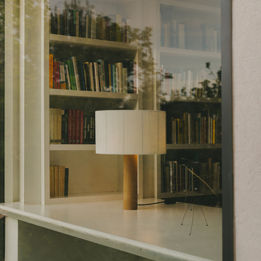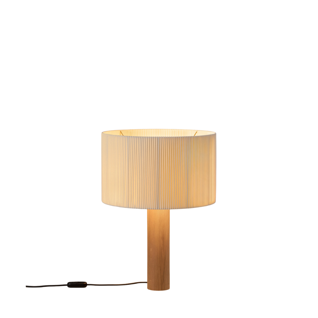 Masivaus medžio cilindras kyla į švytinčią viršūnę, sudarytą iš trijų radialiai išdėstytų lempučių, paslėptų po apskritu gaubtu. Iš baltos medvilninės juostos su šoninėmis briaunomis pagamintas gaubtas — medžiaga, dažnai naudojama knygrišystėje — pasižymi asimetrija, kuri įjungus šviesą sukuria švelnų šviesos ir šešėlio žaismą.
