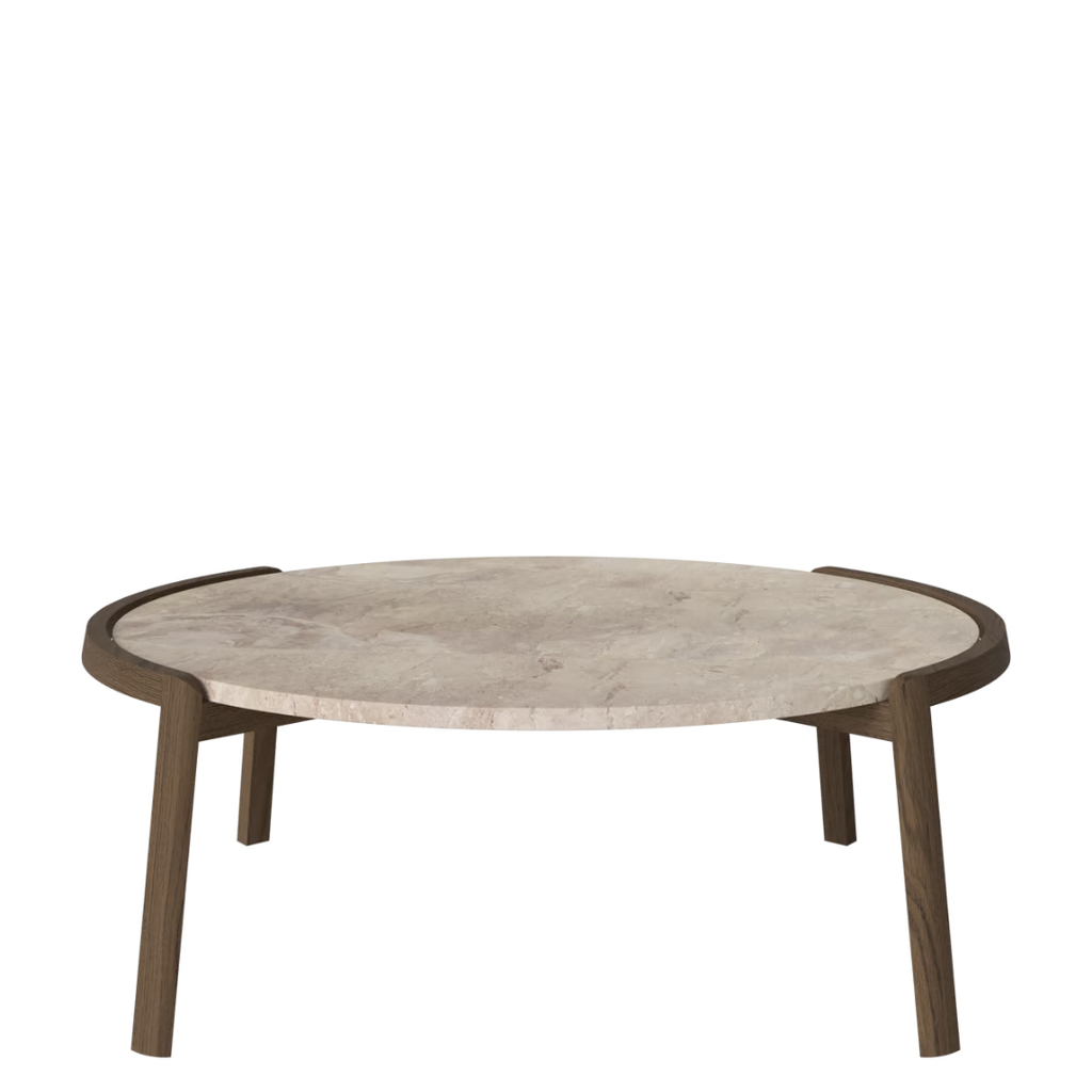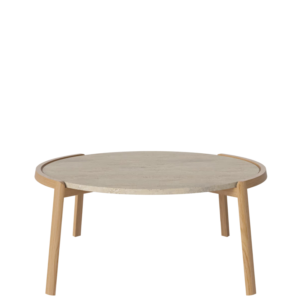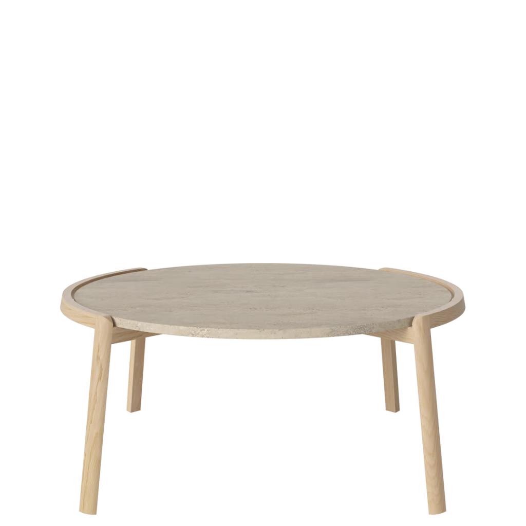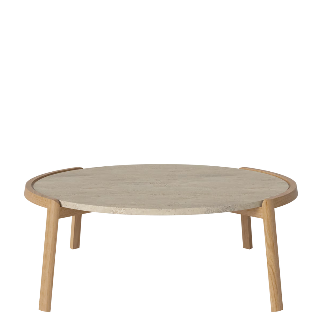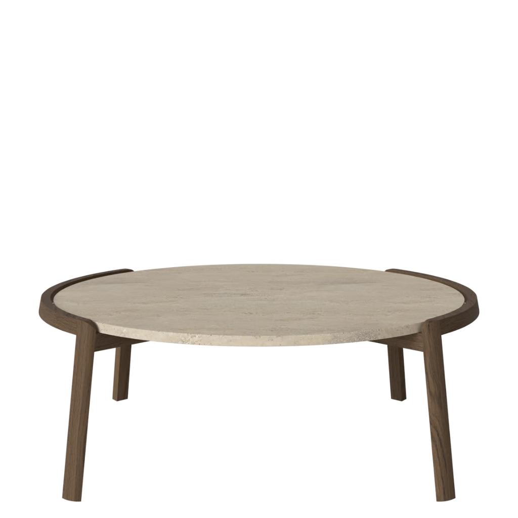 Medžiagiškumas: ąžuolo rėmas, marmuro arba travertino stalviršis. Matmenys: Ø94 cm x aukštis 35/42 cm.