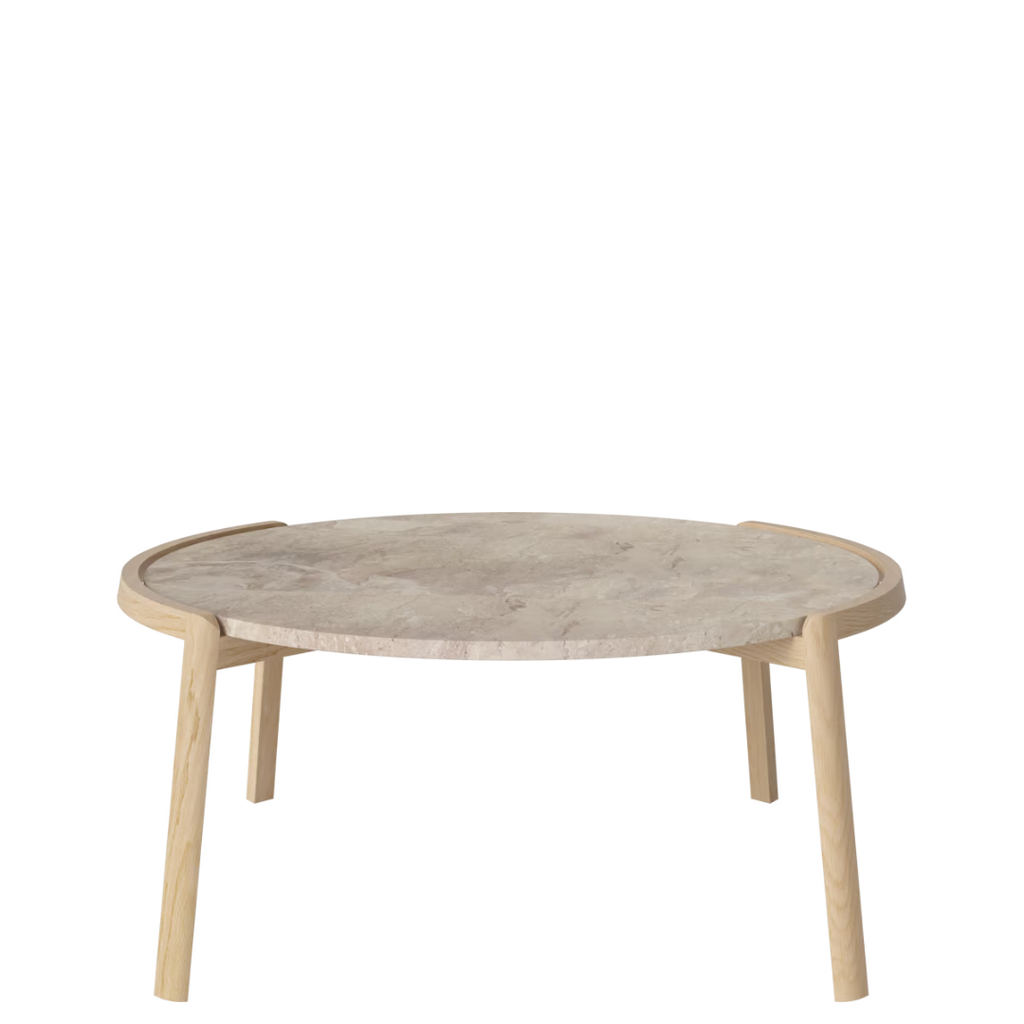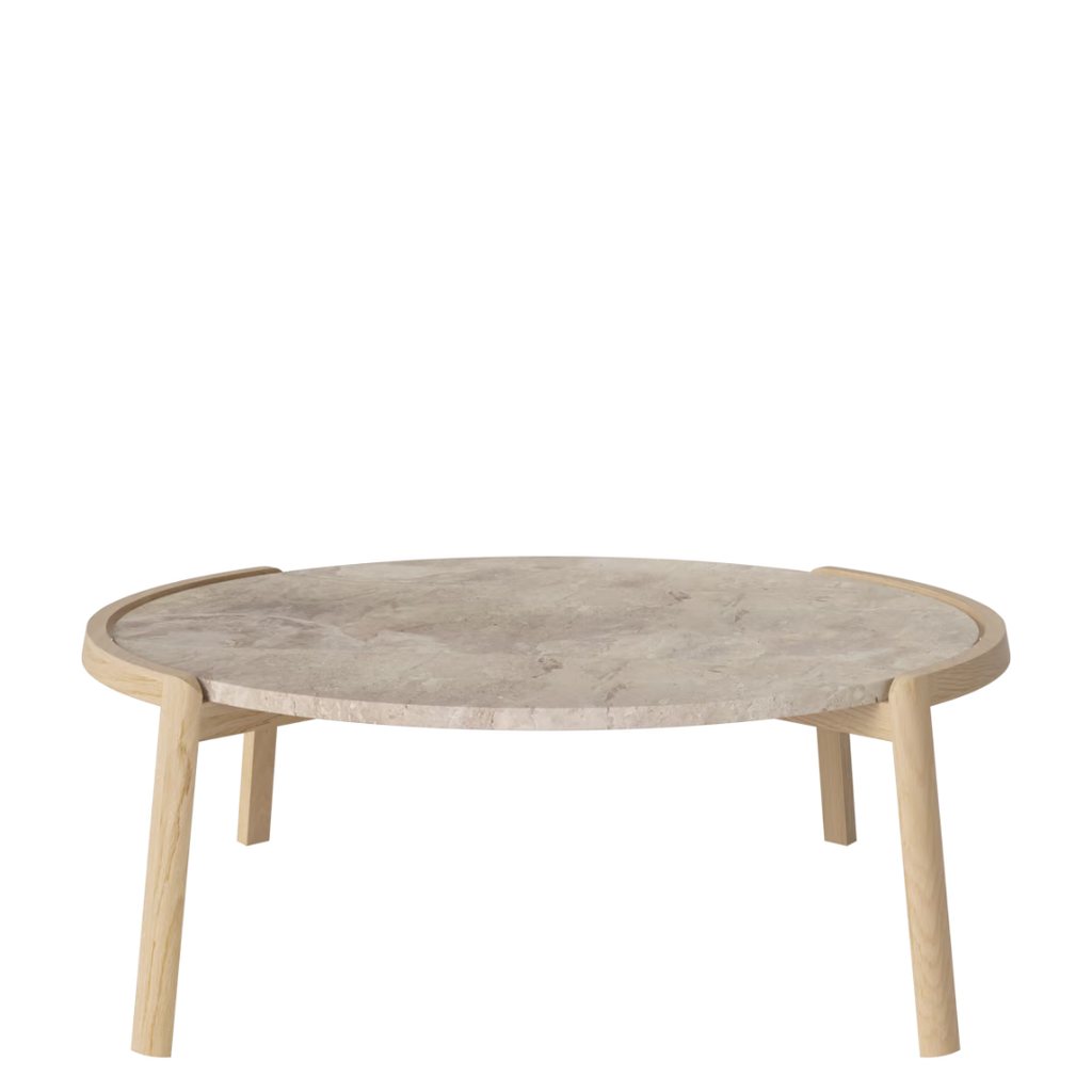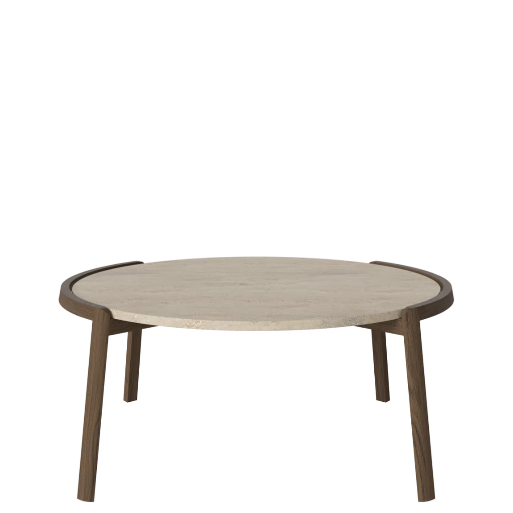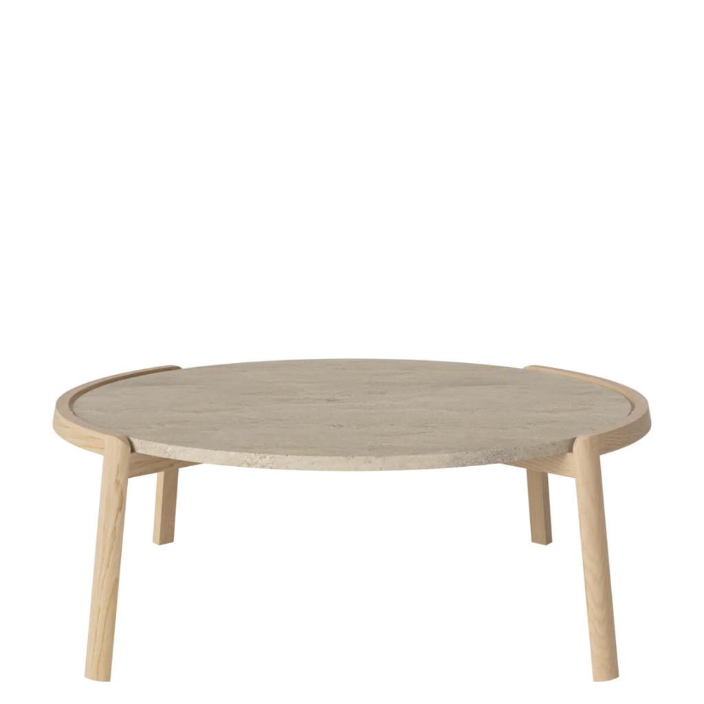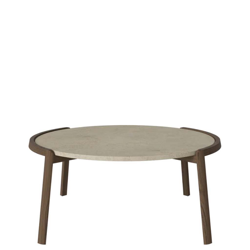 Medžiagiškumas: ąžuolo rėmas, marmuro arba travertino stalviršis. Matmenys: Ø94 cm x aukštis 35/42 cm.