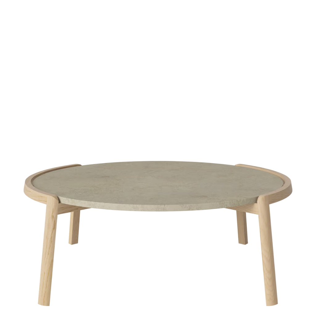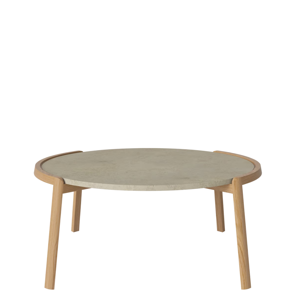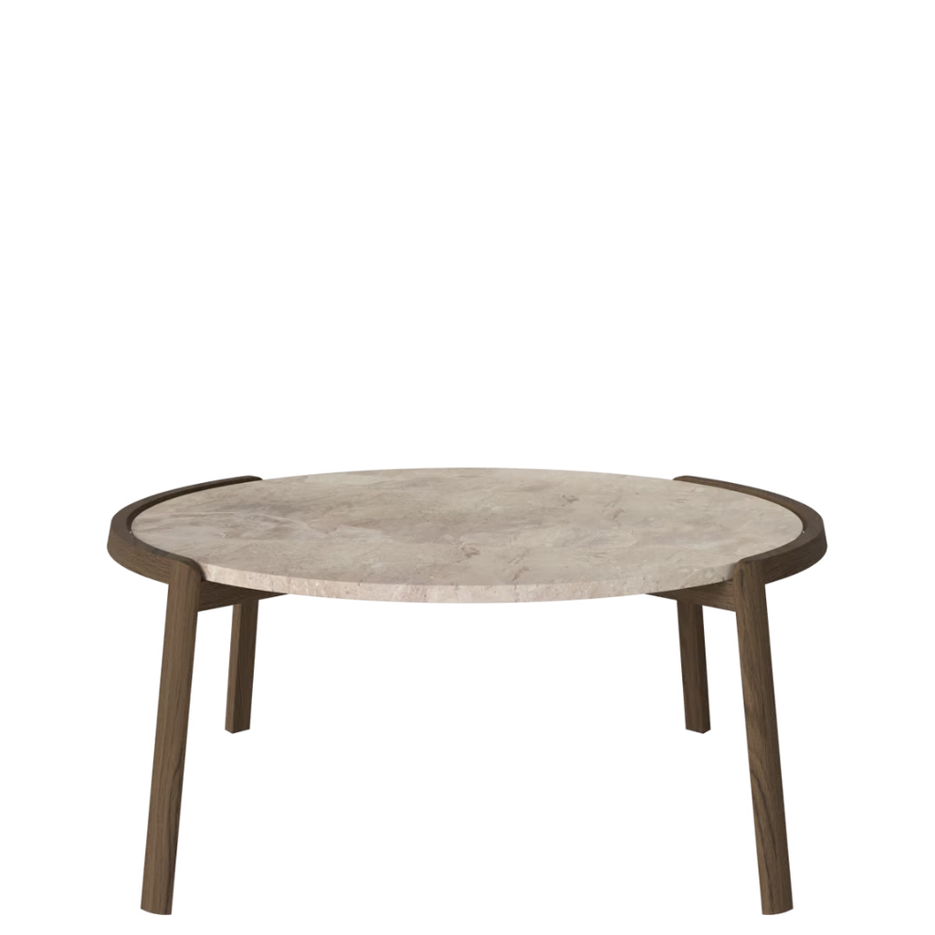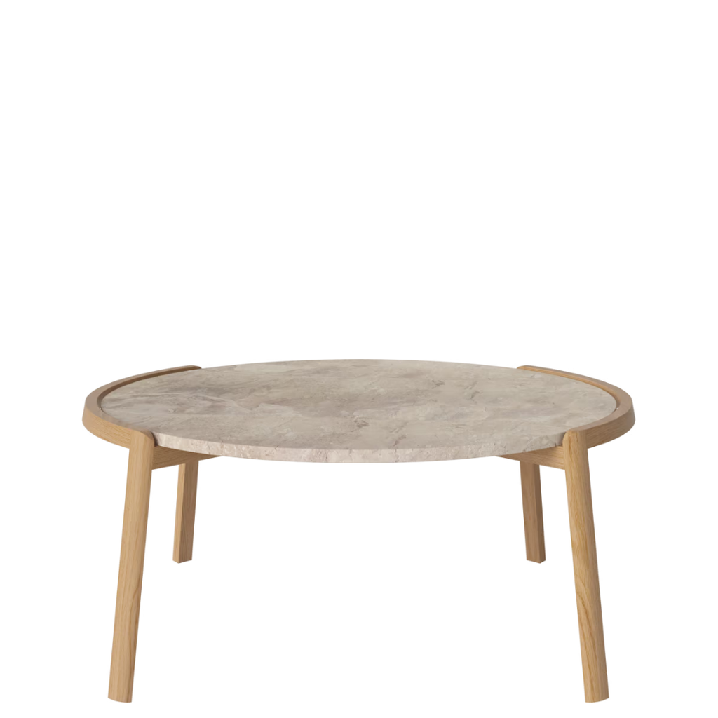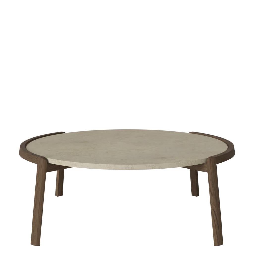 Medžiagiškumas: ąžuolo rėmas, marmuro arba travertino stalviršis. Matmenys: Ø94 cm x aukštis 35/42 cm.
