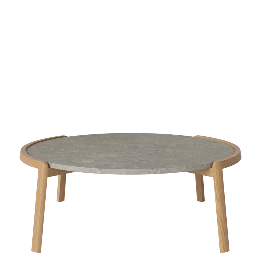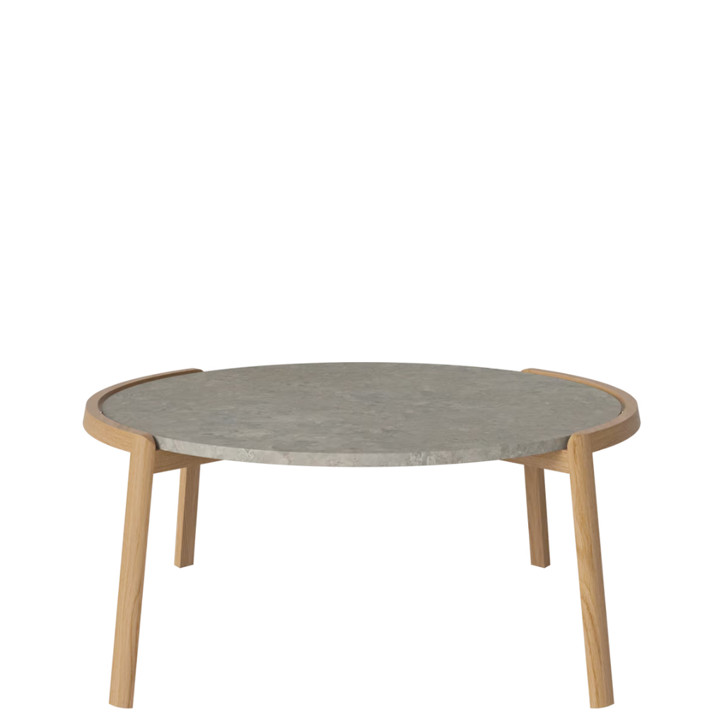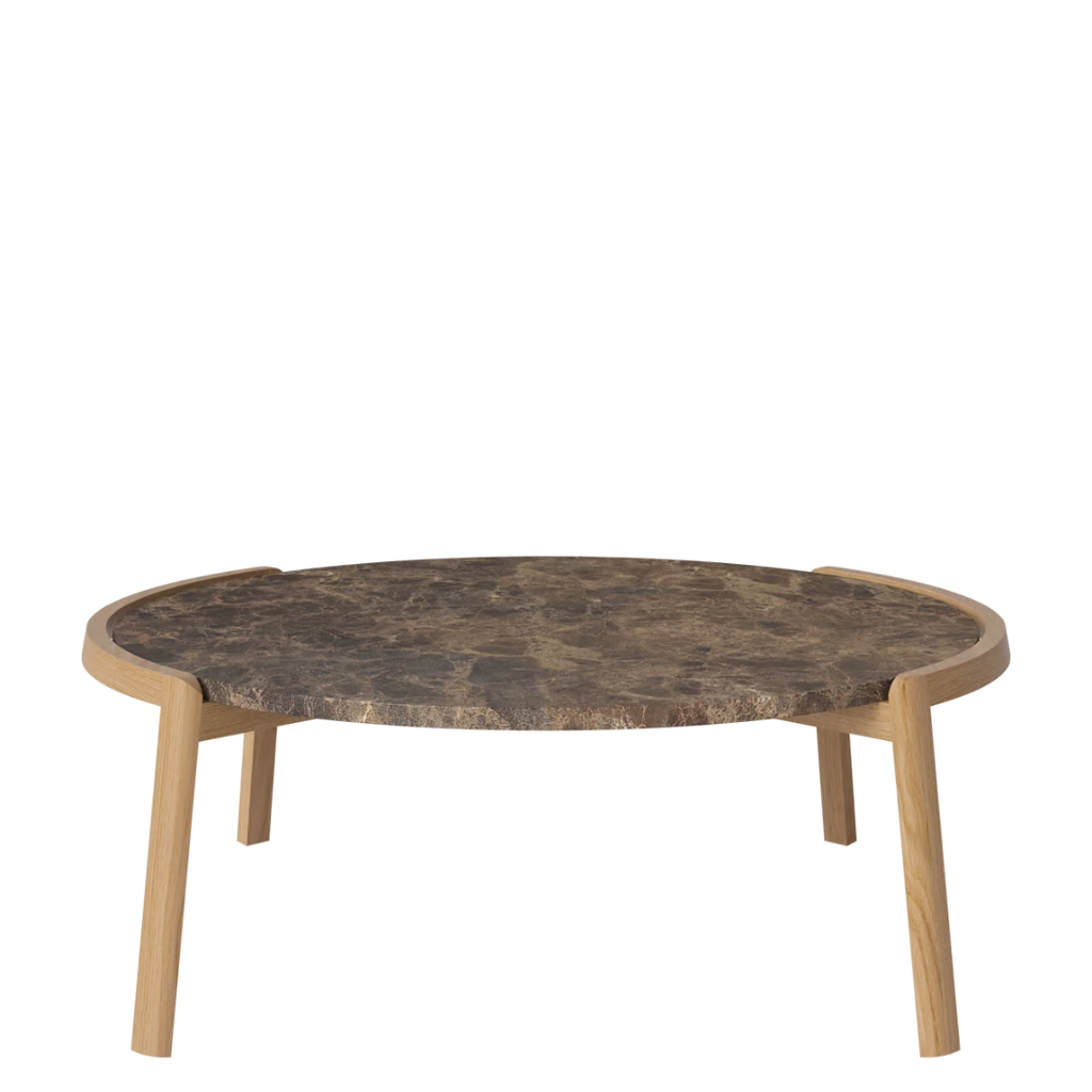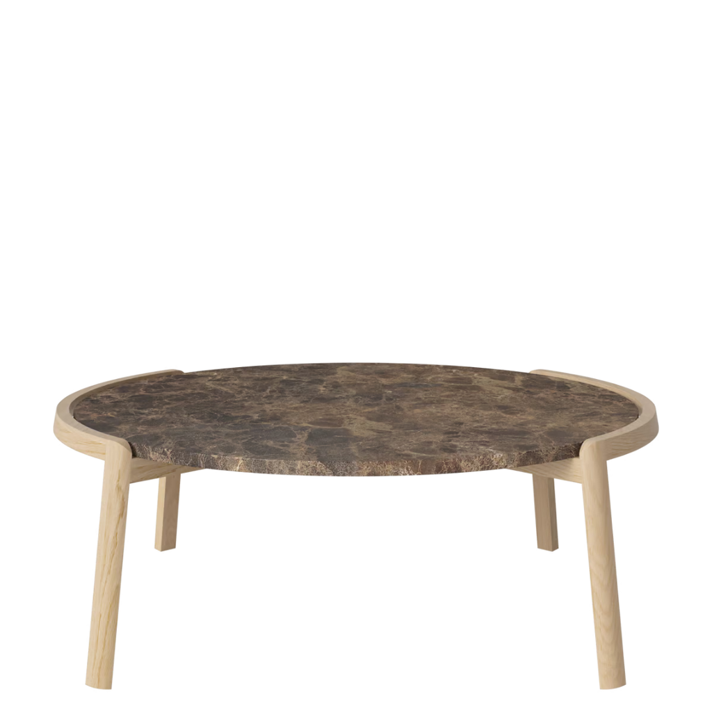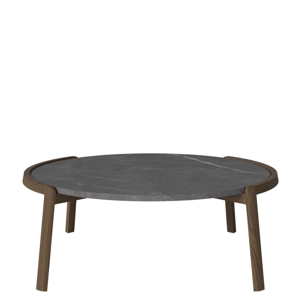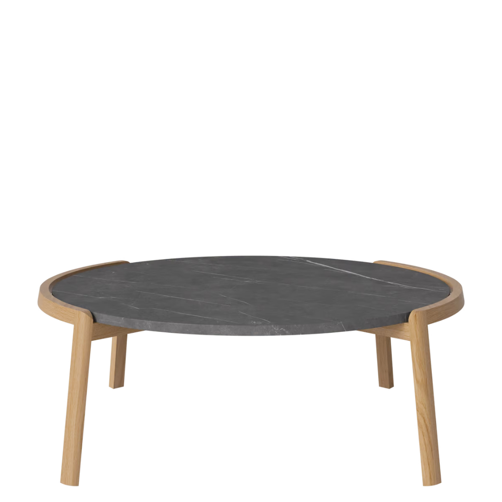 Medžiagiškumas: ąžuolo rėmas, marmuro arba travertino stalviršis. Matmenys: Ø94 cm x aukštis 35/42 cm.