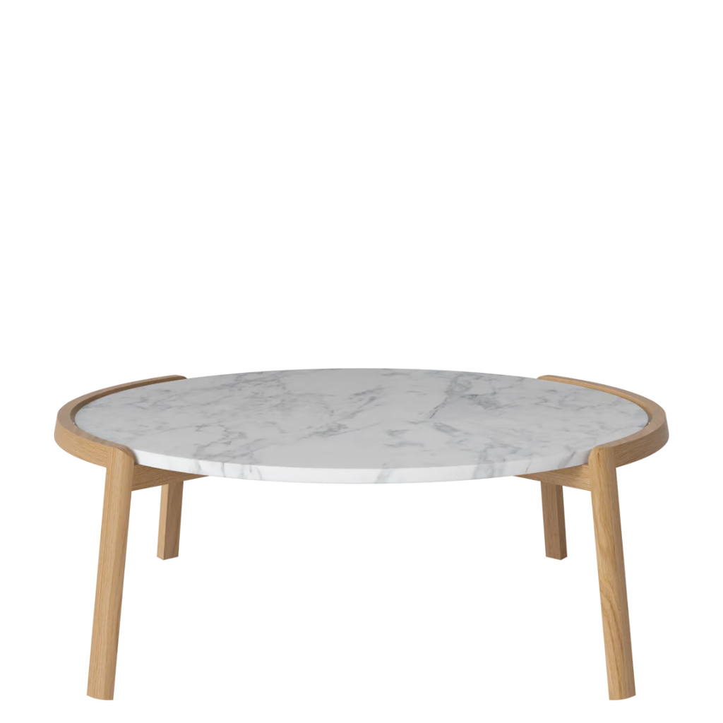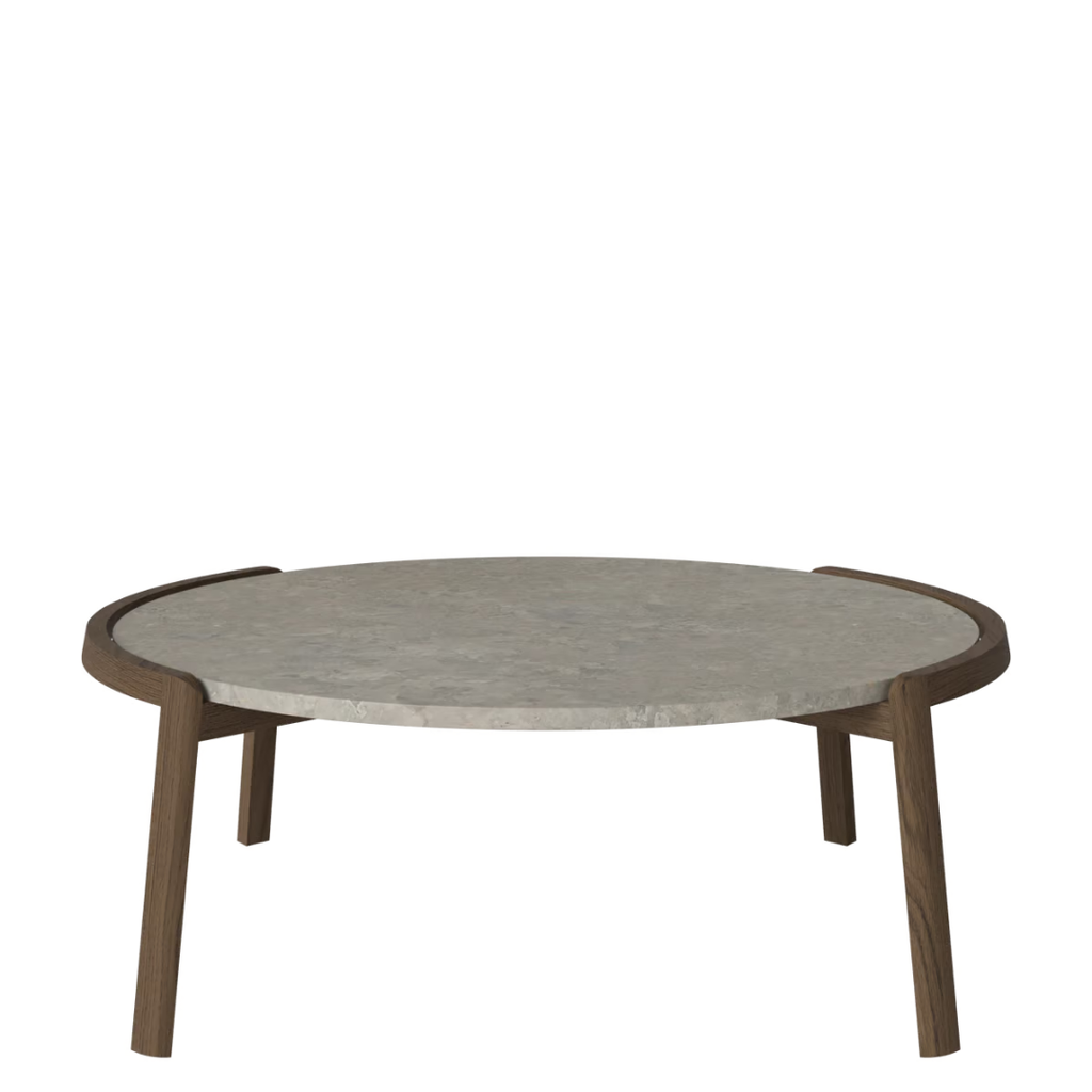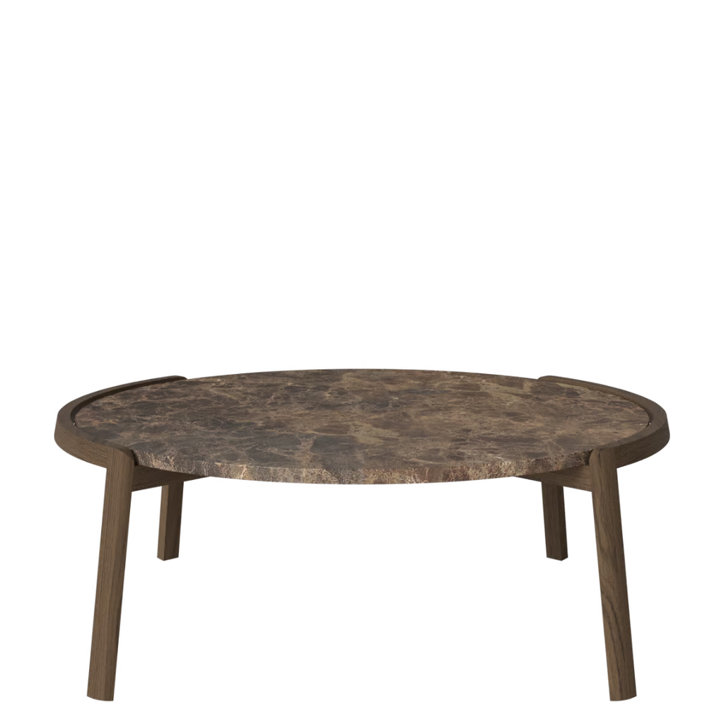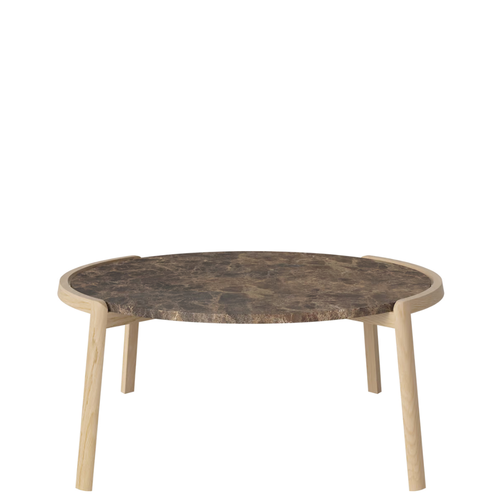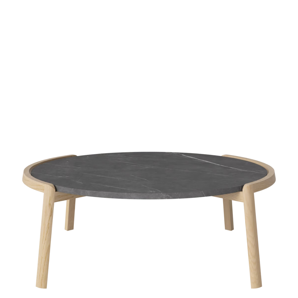 Medžiagiškumas: ąžuolo rėmas, marmuro arba travertino stalviršis. Matmenys: Ø94 cm x aukštis 35/42 cm.