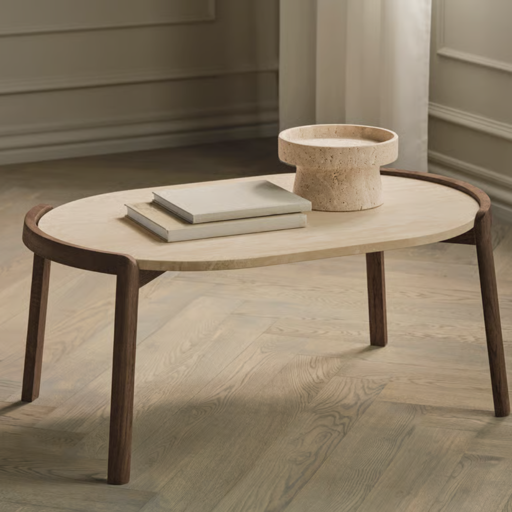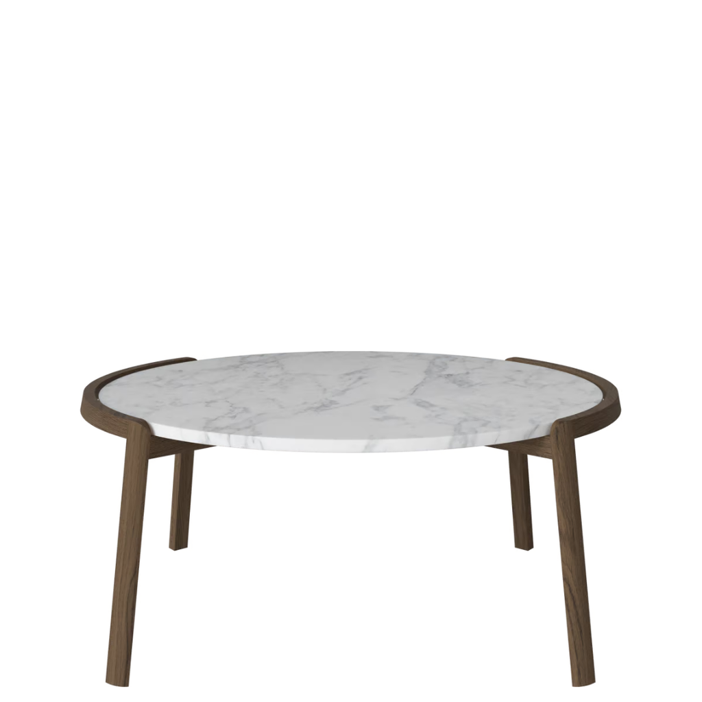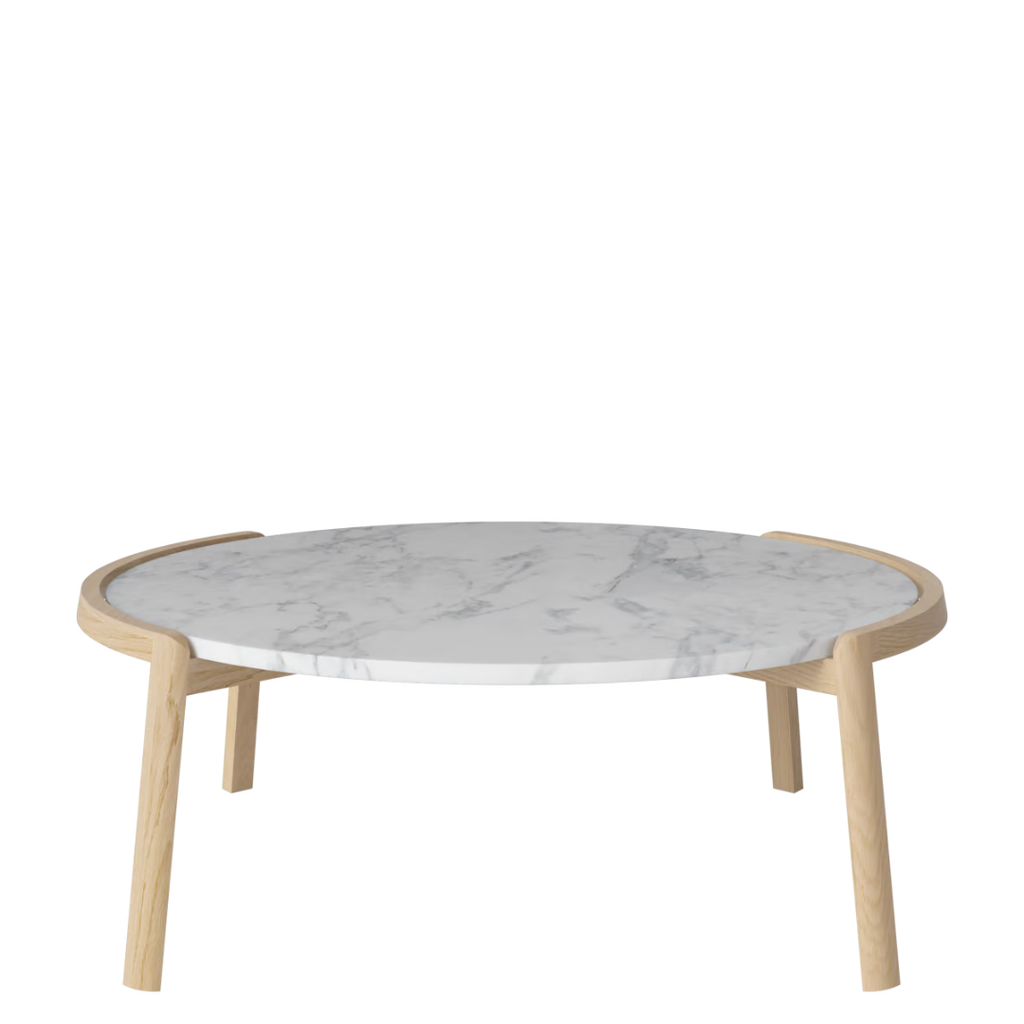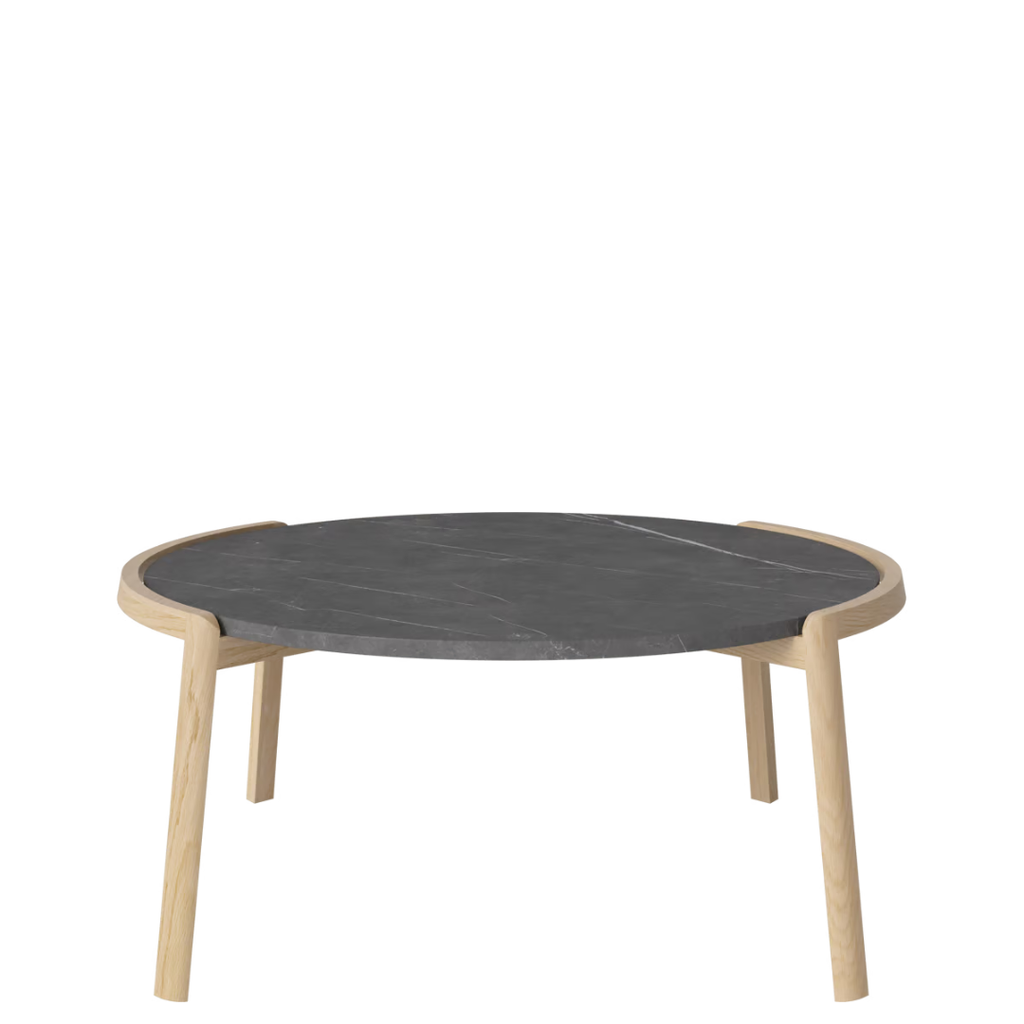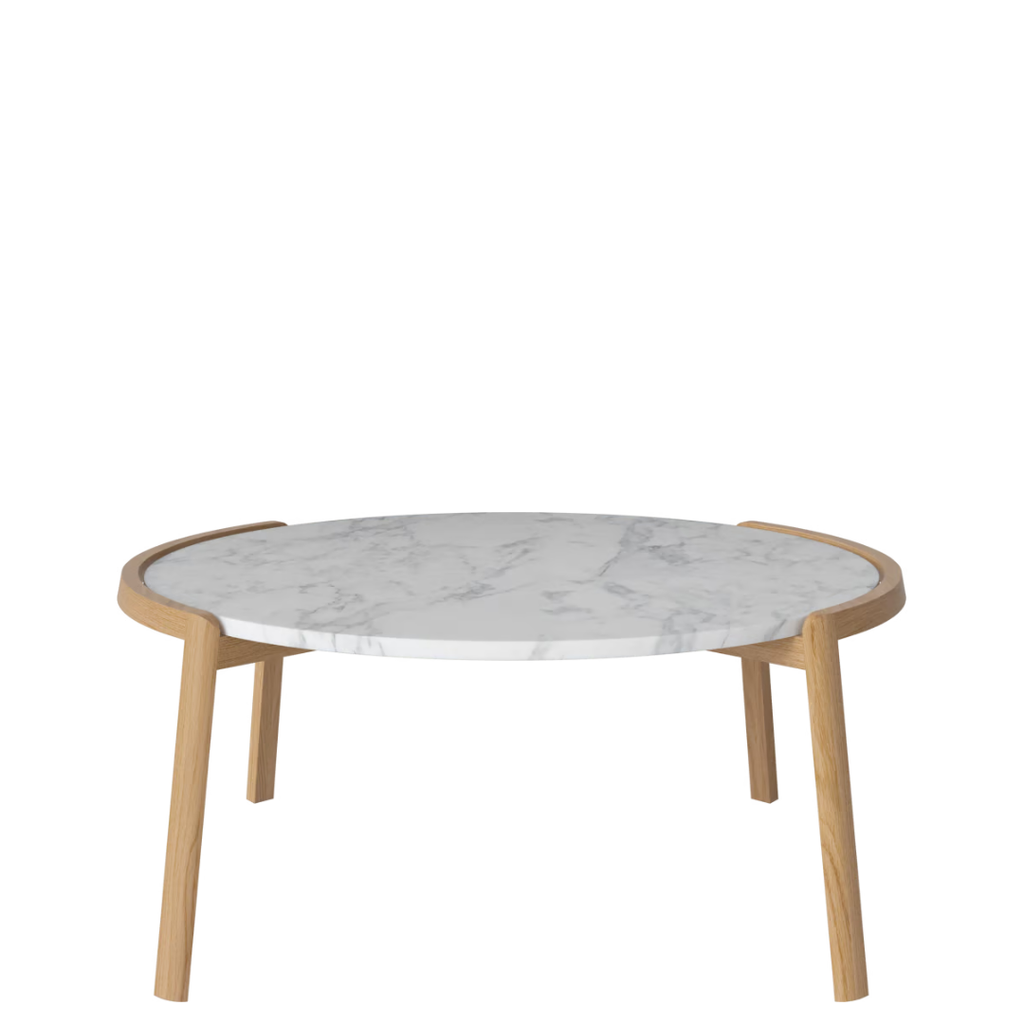 Medžiagiškumas: ąžuolo rėmas, marmuro arba travertino stalviršis. Matmenys: Ø94 cm x aukštis 35/42 cm.