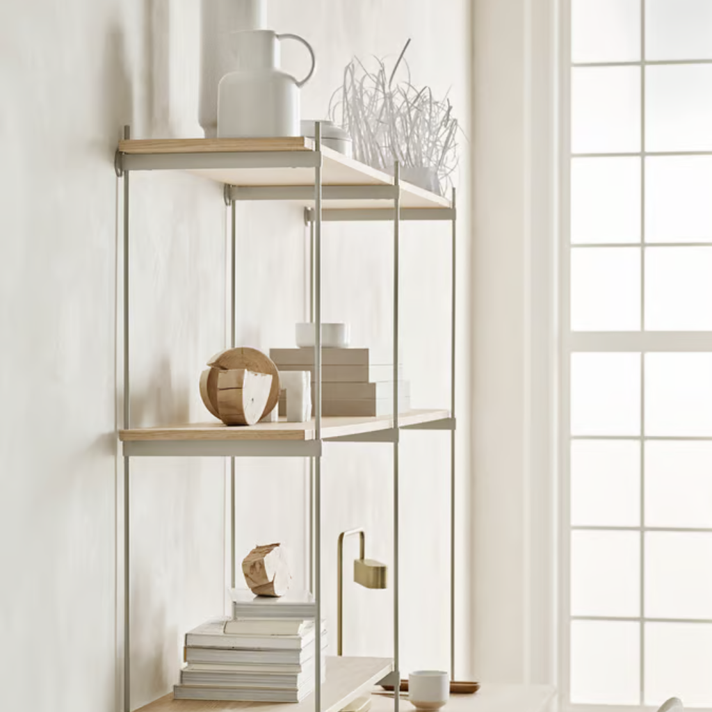 The Rod shelving system gives your creativity free reign. Whether you dream of displaying decorations, a hanger for your clothes or a desk combined with shelves, this sleek framed utilitarian storage system will accommodate your every need. Be inspired by the fixed combinations or simply pick your preference.