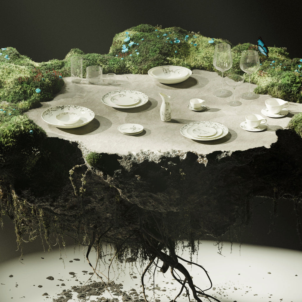 These porcelain plates from the "Unity" collection feature a minimalist shape and a hand-painted illustration by the "Tomorrowland" creative team. Made of high-quality white porcelain, chosen for its timeless elegance.