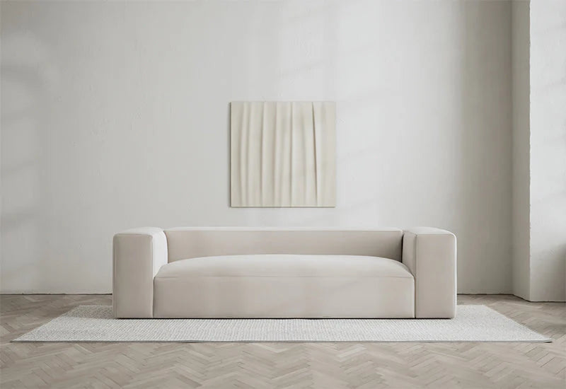 Materiala: shearling-100% Polyester, Certifierat Oeko-Tex, velvet - 100% cotton, cord - 48% Polyester, 44% Acetat, 8% Viscose Certifierat Oeko-Tex. Dimensions: length 240 cm x height 60 cm x depth 100 cm | seat height 30 cm.
