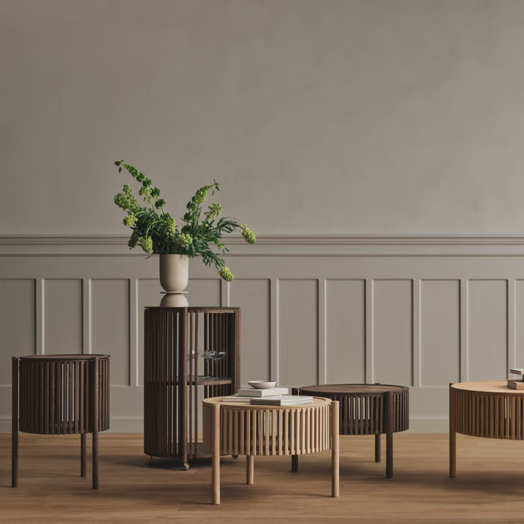 Story is an elegant series of handmade side, coffee and bar tables. Each design features the distinctively airy front formed by the elegant wooden columns. Transparent enough to show off your favourite items or just covered enough to conceal them behind the playful front. The designers behind it, Anna Karnov & Clara Mahler, wanted to create a long-lasting design that meets changing needs and wishes. Emphasised by quality craftsmanship and the natural oak that changes character over the years and makes each table unique with its own original and beautiful story. The tables are made of FSC™-certified wood and each table is assembled with six bolts that are creatively hidden from the naked eye.