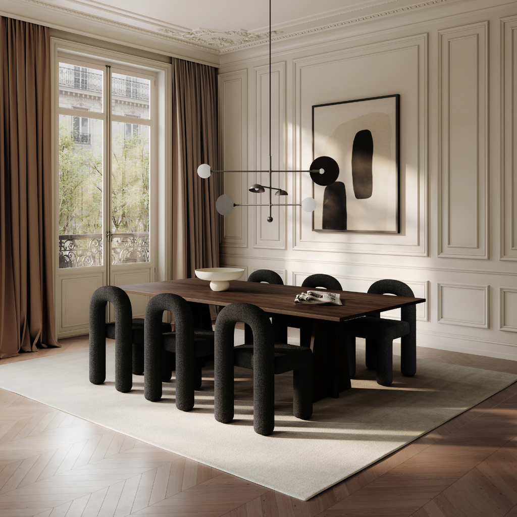 Inspired by modular architecture, the Daiku Dining Chair features a clean, cube-like form made of two interlocking volumes: the backrest and the seat. Their subtle separation creates a light, floating effect, giving the chair a refined architectural presence. Layered foam, rounded edges and minimal stitching balance precision with softness. Upholstered in warm Deep Taupe bouclé, it brings comfort and elegance to any dining setting.