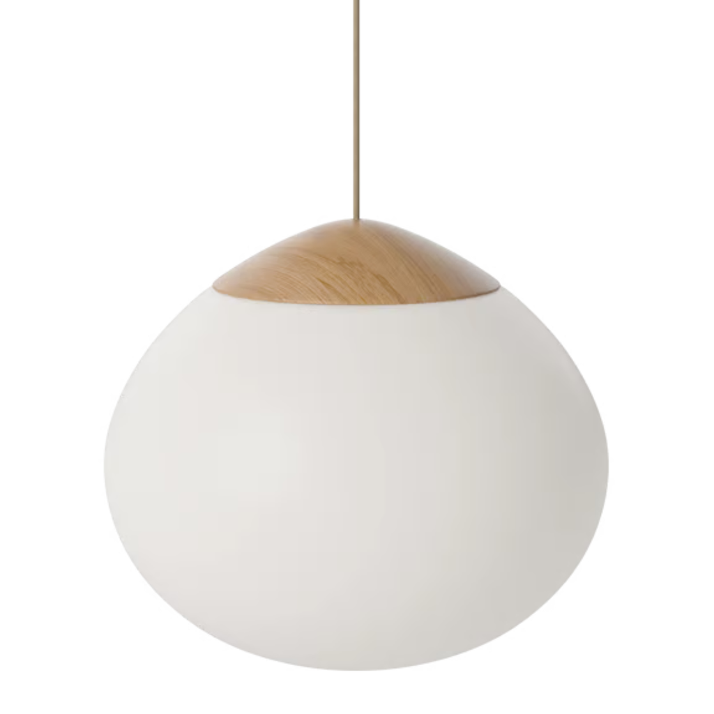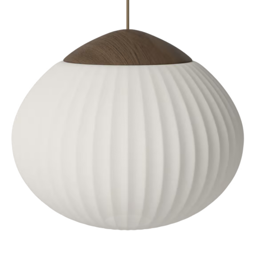 The Acorn lamps share an appealing, organic silhouette – inspired by the characteristic shape of an acorn. The floor lamp adds a striking design element to your interior, with a long suspension arm and foot in elegant travertine or concrete. The delicate lampshade gently diffuses light, and subtle details in FSC™-certified oak add a touch of warmth to the design.